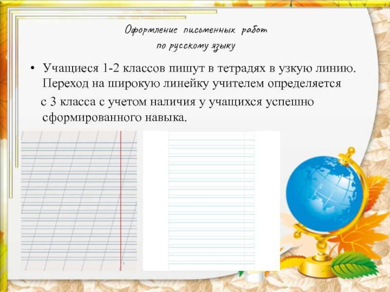 тетрадях в узкую линию. Переход на широкую линейку учителем определяется