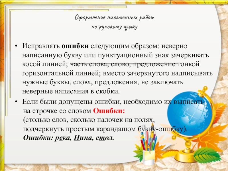 написанную букву или пунктуационный знак зачеркивать косой линией; часть слова, слово, предложение тонкой горизонтальной линией; вместо зачеркнутого надписывать нужные буквы, слова, предложения, не заключать неверные написания в скобки.