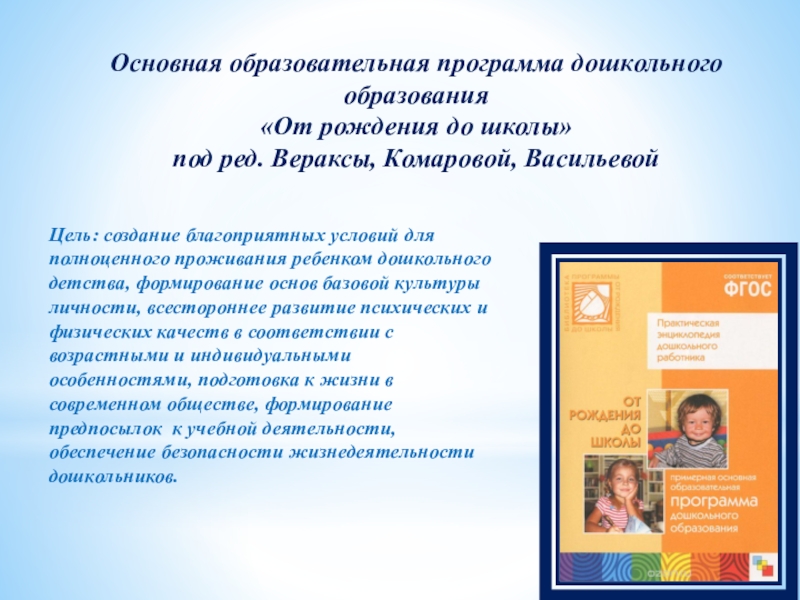 Цель: создание благоприятных условий для полноценного проживания ребенком дошкольного детства, формирование основ базовой культуры личности, всестороннее развитие психических и физических качеств в соответствии с возрастными и индивидуальными особенностями, подготовка к жизни в современном обществе, формирование предпосылок к учебной деятельности, обеспечение безопасности жизнедеятельности дошкольников.