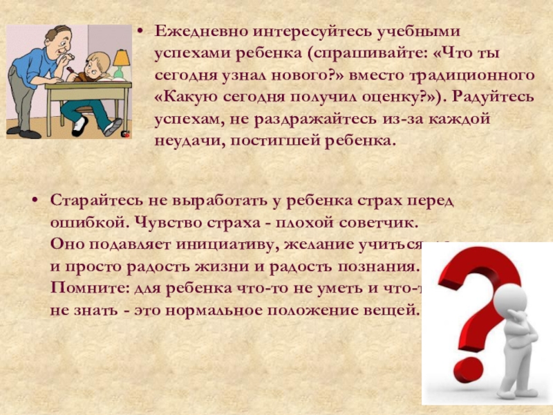 Старайтесь не выработать у ребенка страх перед ошибкой. Чувство страха - плохой советчик. Оно подавляет инициативу, желание учиться, да и просто радость жизни и радость познания. Помните: для ребенка что-то не уметь и что-то не знать - это нормальное положение вещей.