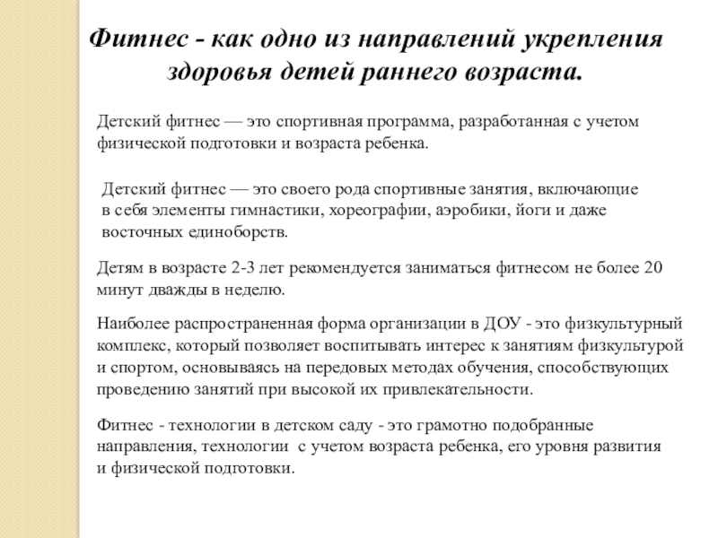 Фитнес - технологии в детском саду - это грамотно подобранные направления, технологии с учетом возраста ребенка, его уровня развития и физической подготовки.