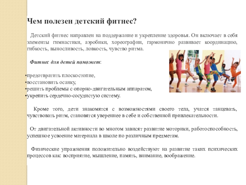 Детский фитнес — это своего рода спортивные занятия, включающие в себя элементы гимнастики, хореографии, аэробики, йоги и даже восточных единоборств.