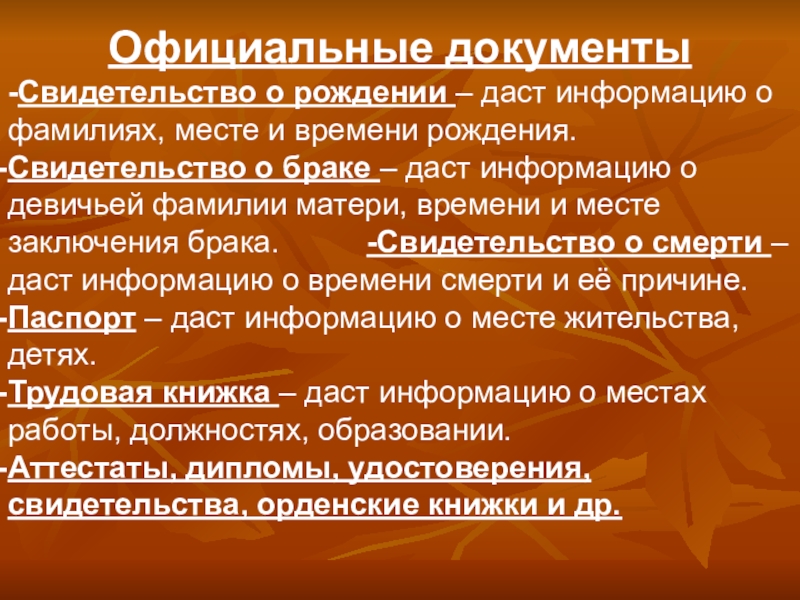 Свидетельство о браке – даст информацию о девичьей фамилии матери, времени и месте заключения брака. -Свидетельство о смерти – даст информацию о времени смерти и её причине.