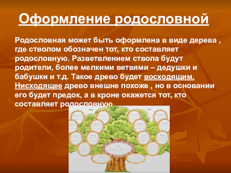 Родословная может быть оформлена в виде дерева , где стволом