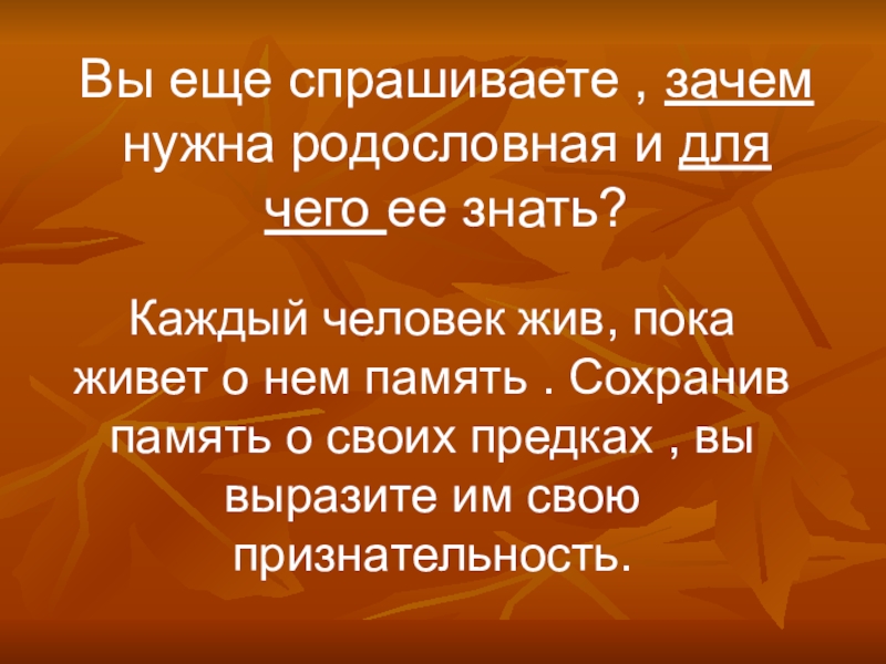 Каждый человек жив, пока живет о нем память . Сохранив память о своих предках , вы выразите им свою признательность.