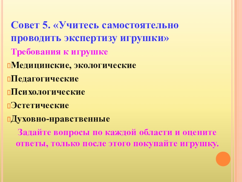 Слайд 8Совет 5. «Учитесь самостоятельно проводить экспертизу игрушки»
