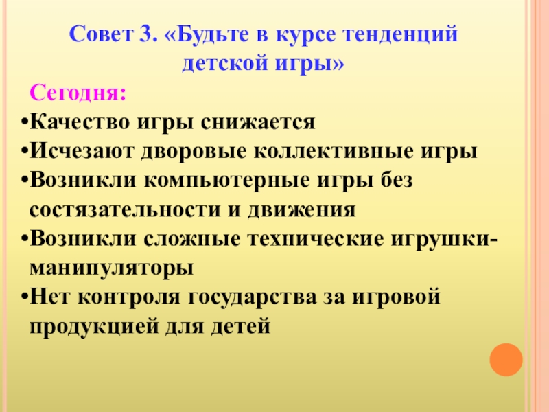 Слайд 5Совет 3. «Будьте в курсе тенденций детской игры»
