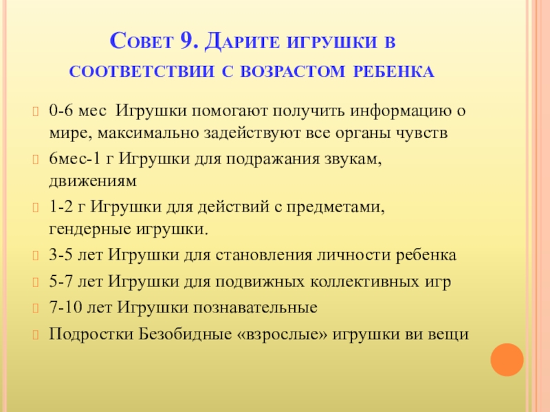 Слайд 18Совет 9. Дарите игрушки в соответствии с возрастом ребенка
