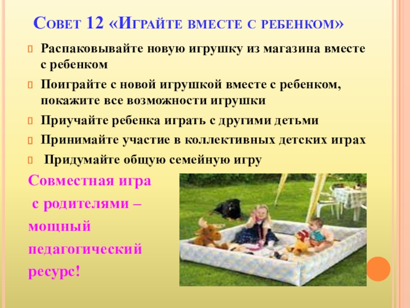 Слайд 21Совет 12 «Играйте вместе с ребенком»