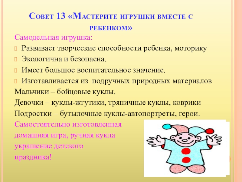 Слайд 22Совет 13 «Мастерите игрушки вместе с ребенком»