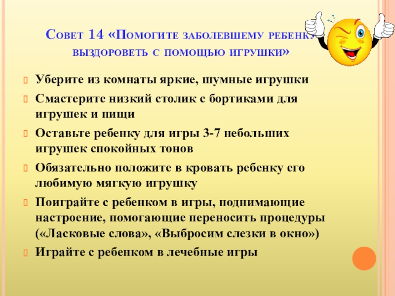 Слайд 23Совет 14 «Помогите заболевшему ребенку выздороветь с помощью игрушки»