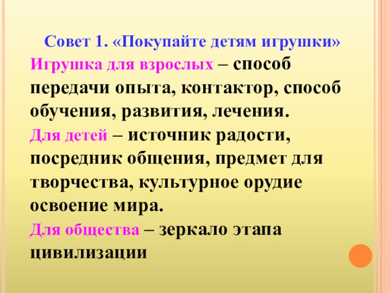 Слайд 3Совет 1. «Покупайте детям игрушки»