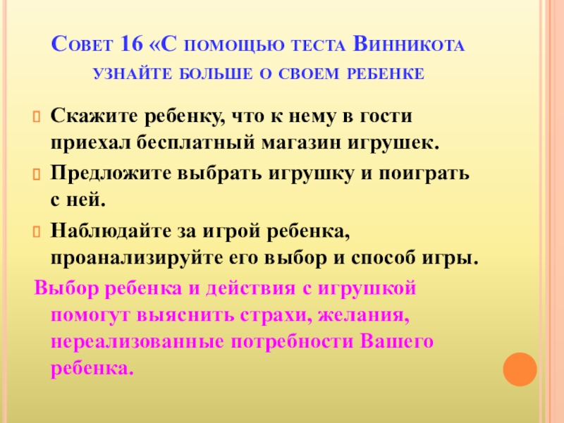 Слайд 25Совет 16 «С помощью теста Винникота узнайте больше о своем ребенке