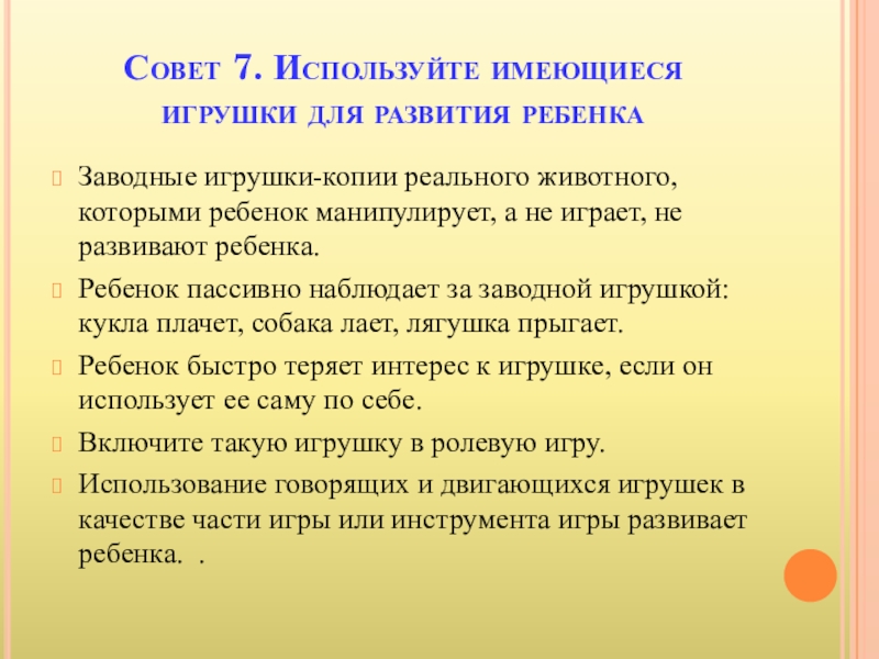 Слайд 16Совет 7. Используйте имеющиеся игрушки для развития ребенка