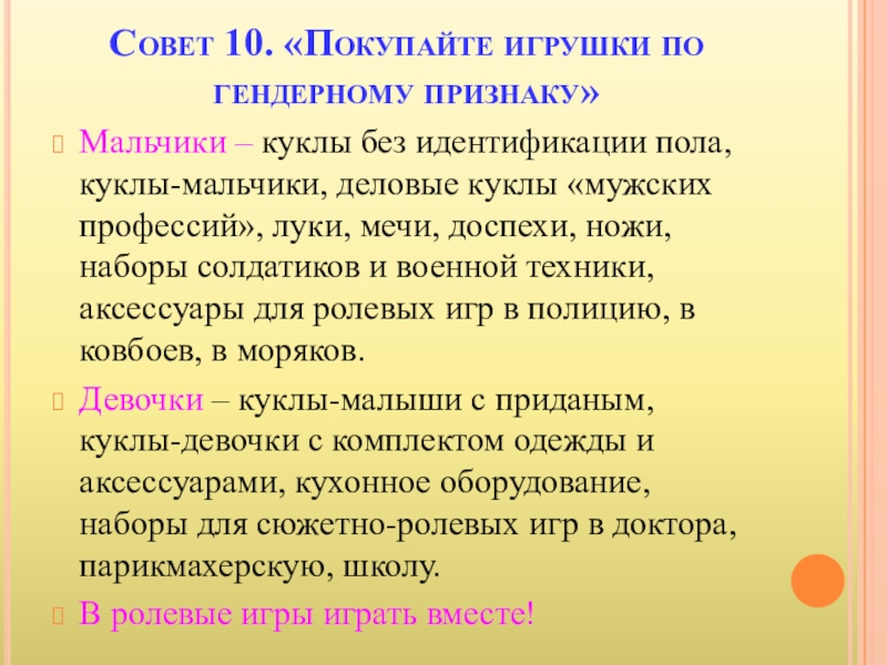 Слайд 19Совет 10. «Покупайте игрушки по гендерному признаку»
