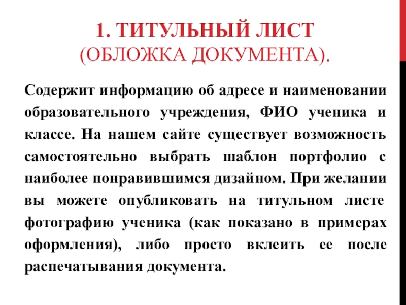 образовательного учреждения, ФИО ученика и классе. На нашем сайте существует возможность самостоятельно выбрать шаблон портфолио с наиболее понравившимся дизайном. При желании вы можете опубликовать на титульном листе фотографию ученика (как показано в примерах оформления), либо просто вклеить ее после распечатывания документа.
