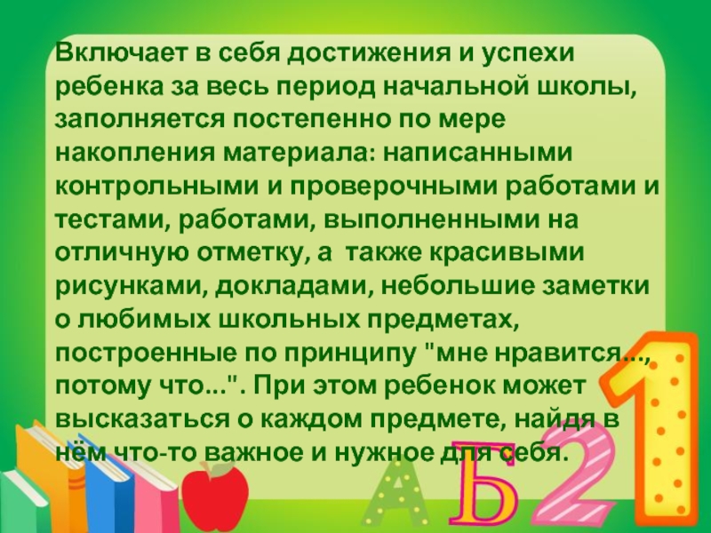 Слайд 13Включает в себя достижения и успехи ребенка за весь период начальной