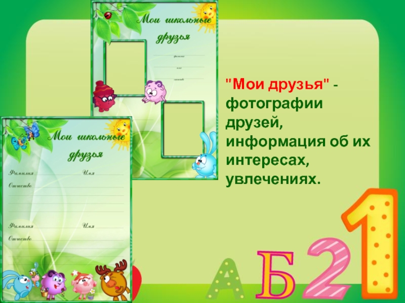 Слайд 8"Мои друзья" - фотографии друзей, информация об их интересах, увлечениях.