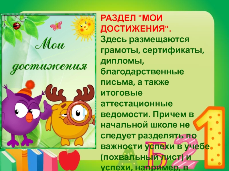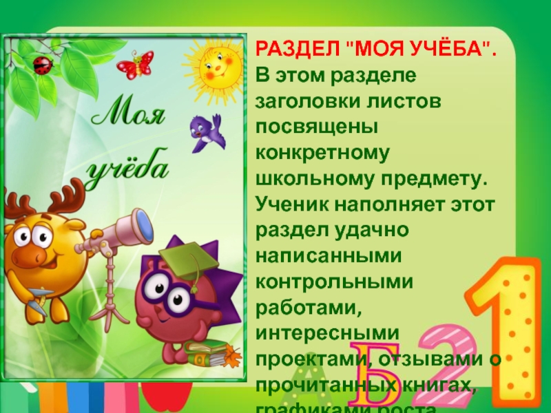 предмету. Ученик наполняет этот раздел удачно написанными контрольными работами, интересными проектами, отзывами о прочитанных книгах, графиками роста скорости чтения, творческими работами.