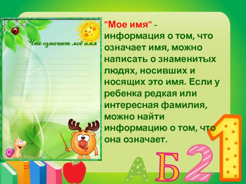 Слайд 5"Мое имя" - информация о том, что означает имя, можно написать о знаменитых людях,