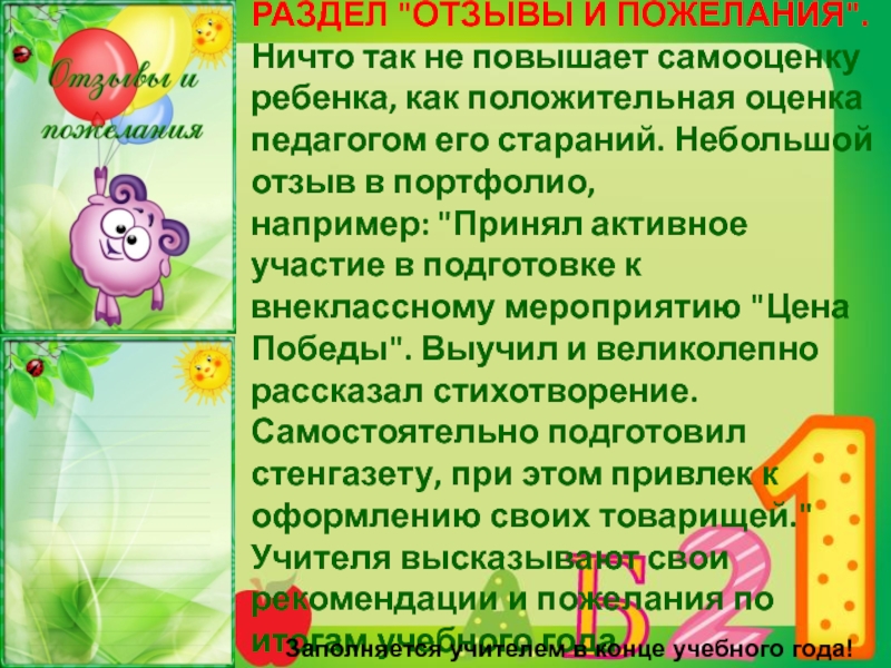 положительная оценка педагогом его стараний. Небольшой отзыв в портфолио, например: "Принял активное участие в подготовке к внеклассному мероприятию "Цена Победы". Выучил и великолепно рассказал стихотворение. Самостоятельно подготовил стенгазету, при этом привлек к оформлению своих товарищей."
