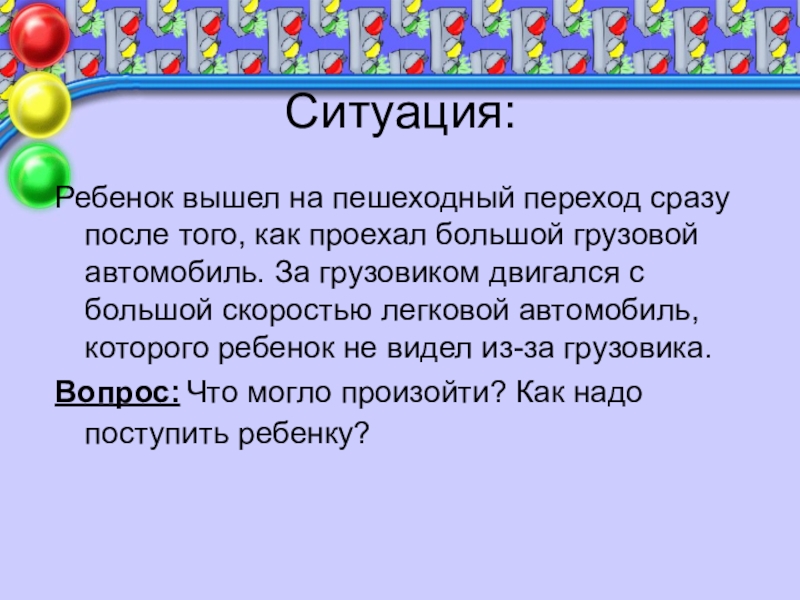 Ситуация:Девочка переходила улицу, посмотрела кругом и увидела, что из переулка выезжает грузовик. Смотрела невнимательно, не обратила внимания,