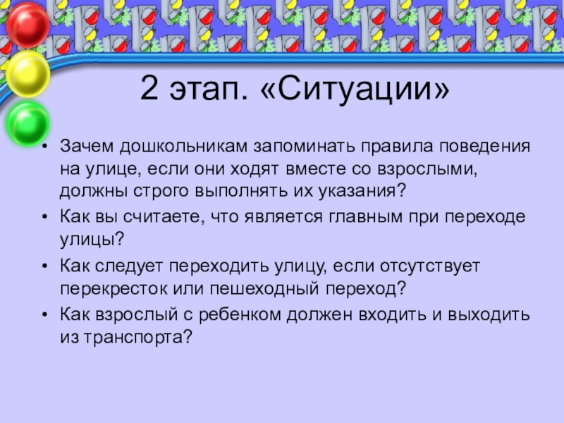 2 этап. «Ситуации»Зачем дошкольникам запоминать правила поведения на улице, если они ходят вместе со взрослыми, должны строго