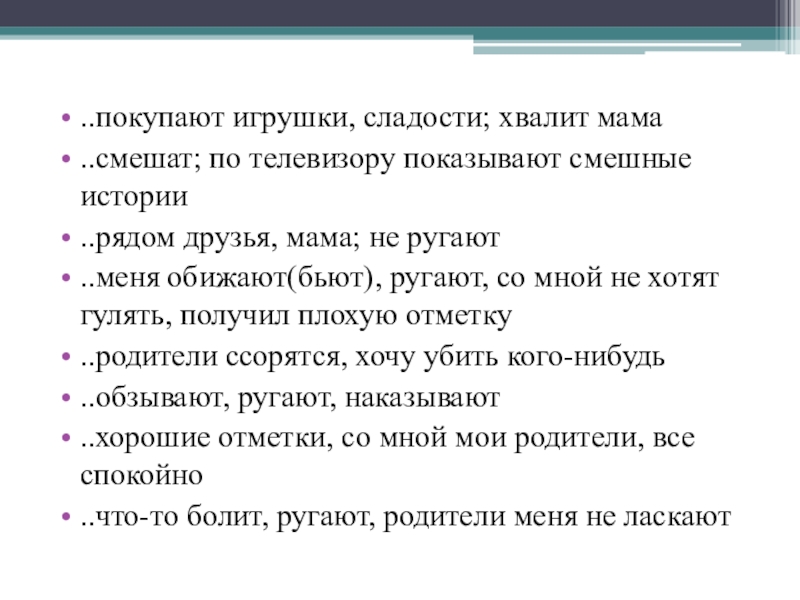 ..покупают игрушки, сладости; хвалит мама..смешат; по телевизору показывают смешные истории..рядом друзья, мама; не ругают..меня обижают(бьют), ругают, со