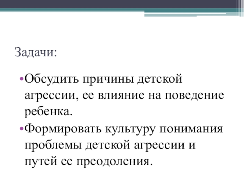 Задачи:Обсудить причины детской агрессии, ее влияние на поведение ребенка.Формировать культуру понимания проблемы детской агрессии и путей ее