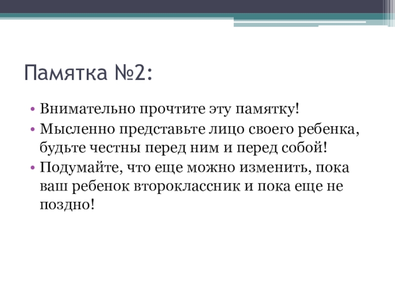 Памятка №2:Внимательно прочтите эту памятку!Мысленно представьте лицо своего ребенка, будьте честны перед ним и перед собой!Подумайте, что
