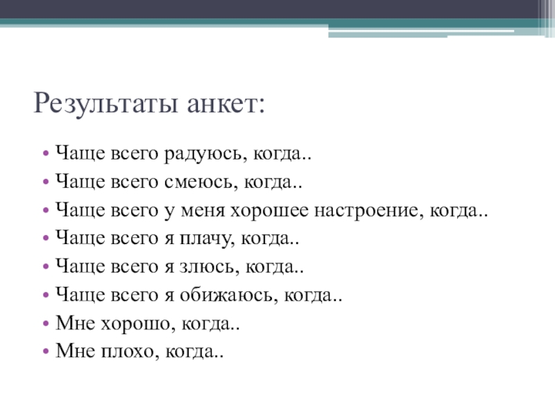Результаты анкет:Чаще всего радуюсь, когда..Чаще всего смеюсь, когда..Чаще всего у меня хорошее настроение, когда..Чаще всего я плачу,