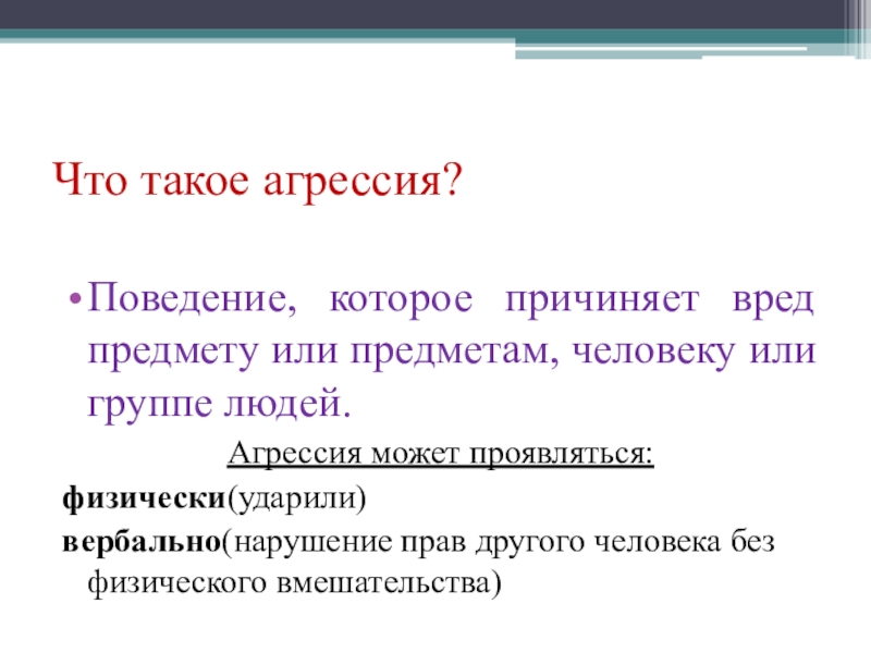 Что такое агрессия?Поведение, которое причиняет вред предмету или предметам, человеку или группе людей.Агрессия может проявляться:физически(ударили) вербально(нарушение прав