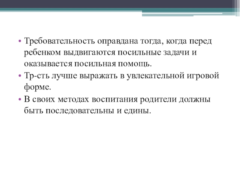 Слайд 12Требовательность оправдана тогда, когда перед ребенком выдвигаются посильные задачи и оказывается