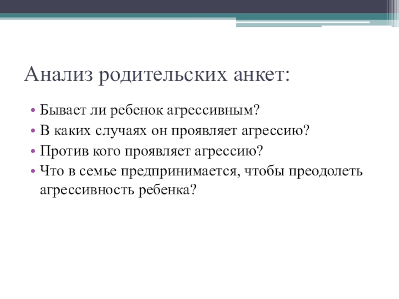 Анализ родительских анкет:Бывает ли ребенок агрессивным?В каких случаях он проявляет агрессию?Против кого проявляет агрессию?Что в семье предпринимается,