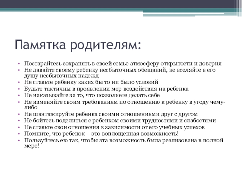 Памятка родителям:Постарайтесь сохранять в своей семье атмосферу открытости и доверияНе давайте своему ребенку несбыточных обещаний, не вселяйте