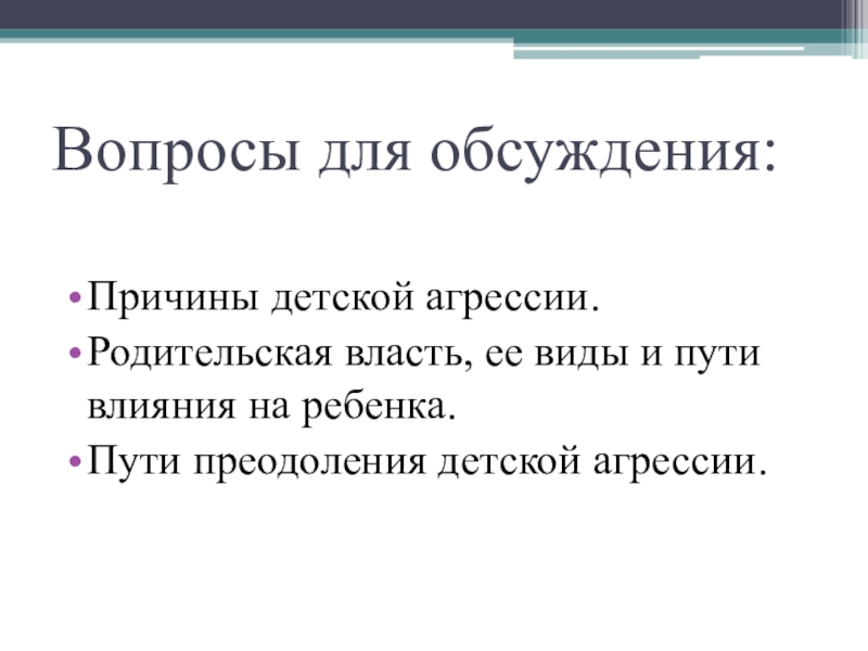 Вопросы для обсуждения:Причины детской агрессии.Родительская власть, ее виды и пути влияния на ребенка.Пути преодоления детской агрессии.