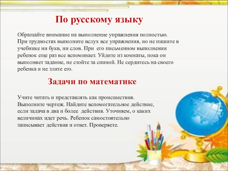 Учите читать и представлять как происшествия. Выполните чертеж. Найдите вспомогательное действие, если задача в два и более действия. Уточняем, о каких величинах идет речь. Ребенок самостоятельно записывает действия и ответ. Проверяете.