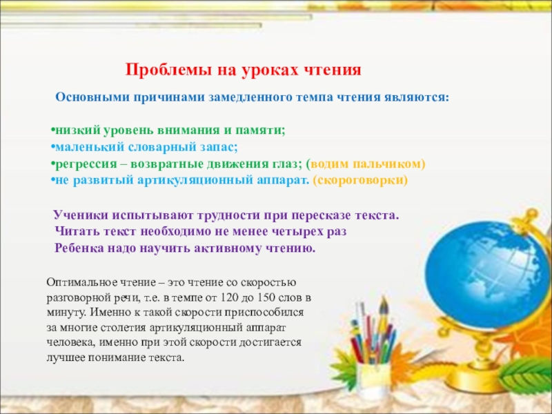 Оптимальное чтение – это чтение со скоростью разговорной речи, т.е. в темпе от 120 до 150 слов в минуту. Именно к такой скорости приспособился за многие столетия артикуляционный аппарат человека, именно при этой скорости достигается лучшее понимание текста.