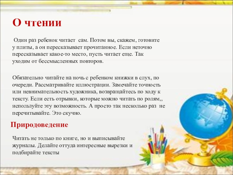 Обязательно читайте на ночь с ребенком книжки в слух, по очереди. Рассматривайте иллюстрации. Замечайте точность или невнимательность художника, возвращайтесь по ходу к тексту. Если есть отрывки, которые можно читать по ролям,, используйте эту возможность. А просто так несколько раз не перечитывайте. Это скучно.