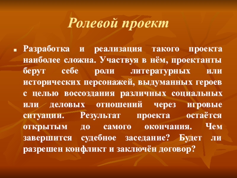 проектанты берут себе роли литературных или исторических персонажей, выдуманных героев с целью воссоздания различных социальных или деловых отношений через игровые ситуации. Результат проекта остаётся открытым до самого окончания. Чем завершится судебное заседание? Будет ли разрешен конфликт и заключён договор?