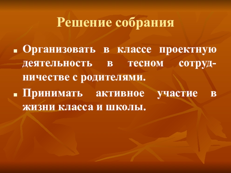 Организовать в классе проектную деятельность в тесном сотруд-ничестве с родителями.