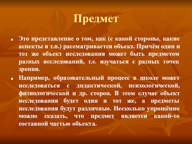 Например, образовательный процесс в школе может исследоваться с дидактической, психологической, физиологической и др. сторон. В этом случае объект исследования будет один и тот же, а предметы исследования будут различные. Несколько упрощённо можно сказать, что предмет является какой-то составной частью объекта.