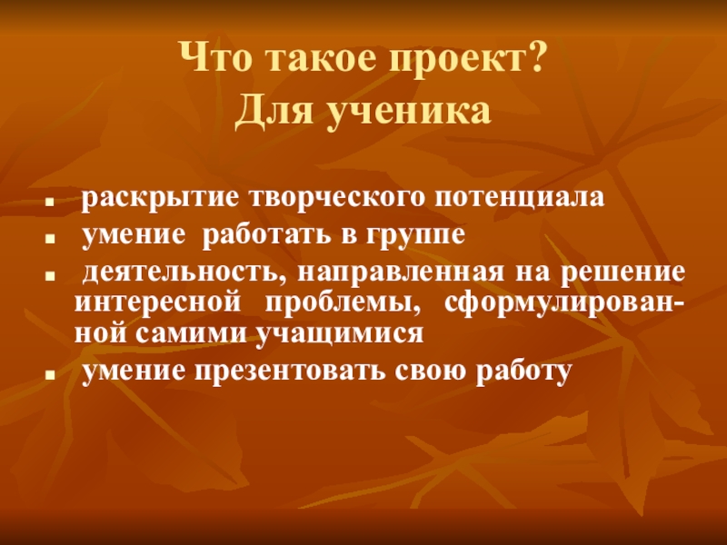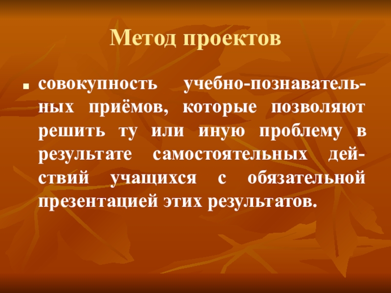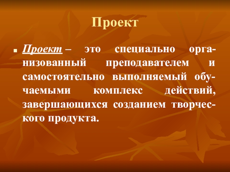 Проект – это специально орга-низованный преподавателем и самостоятельно выполняемый обу-чаемыми комплекс действий,