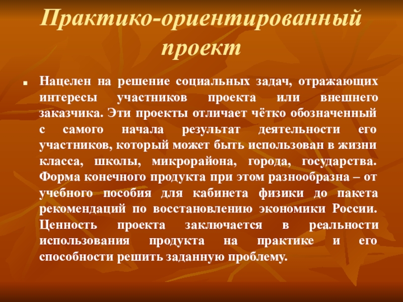 внешнего заказчика. Эти проекты отличает чётко обозначенный с самого начала результат деятельности его участников, который может быть использован в жизни класса, школы, микрорайона, города, государства. Форма конечного продукта при этом разнообразна – от учебного пособия для кабинета физики до пакета рекомендаций по восстановлению экономики России. Ценность проекта заключается в реальности использования продукта на практике и его способности решить заданную проблему.