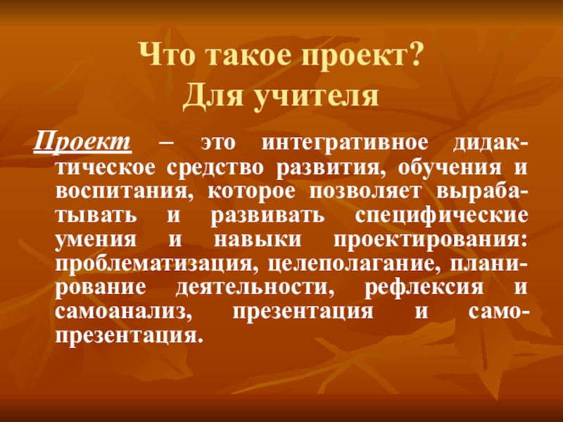 Проект – это интегративное дидак-тическое средство развития, обучения
