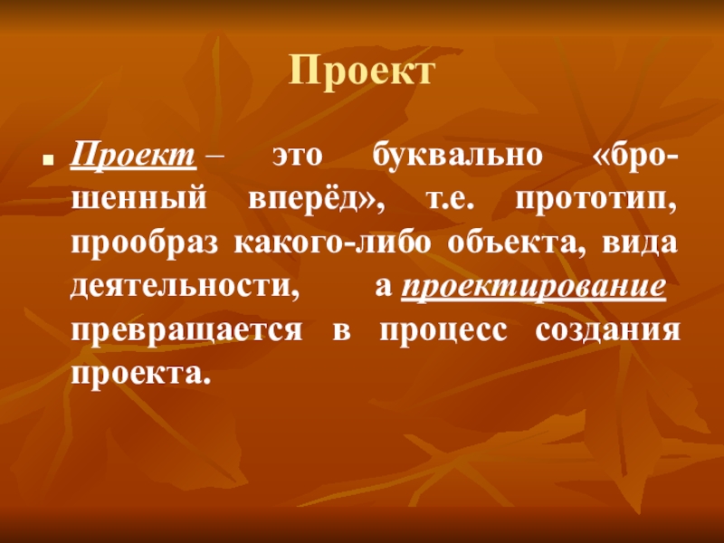 Проект – это буквально «бро-шенный вперёд», т.е. прототип, прообраз какого-либо объекта, вида