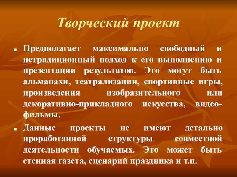 Предполагает максимально свободный и нетрадиционный подход к его выполнению и