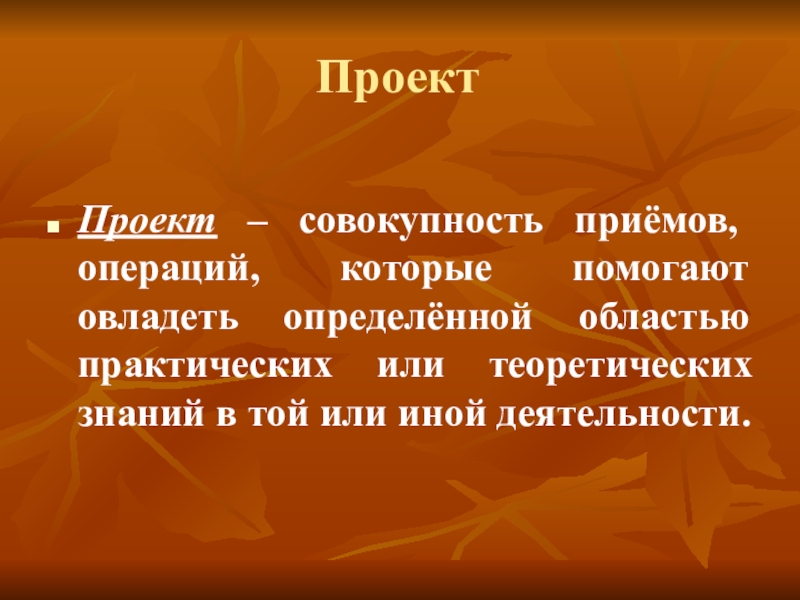 Проект – совокупность приёмов, операций, которые помогают овладеть определённой областью практических