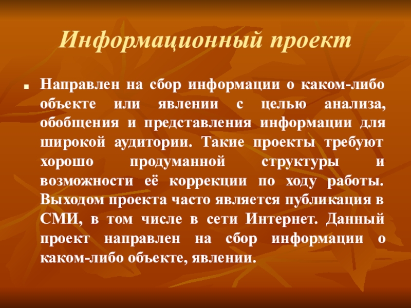 целью анализа, обобщения и представления информации для широкой аудитории. Такие проекты требуют хорошо продуманной структуры и возможности её коррекции по ходу работы. Выходом проекта часто является публикация в СМИ, в том числе в сети Интернет. Данный проект направлен на сбор информации о каком-либо объекте, явлении.