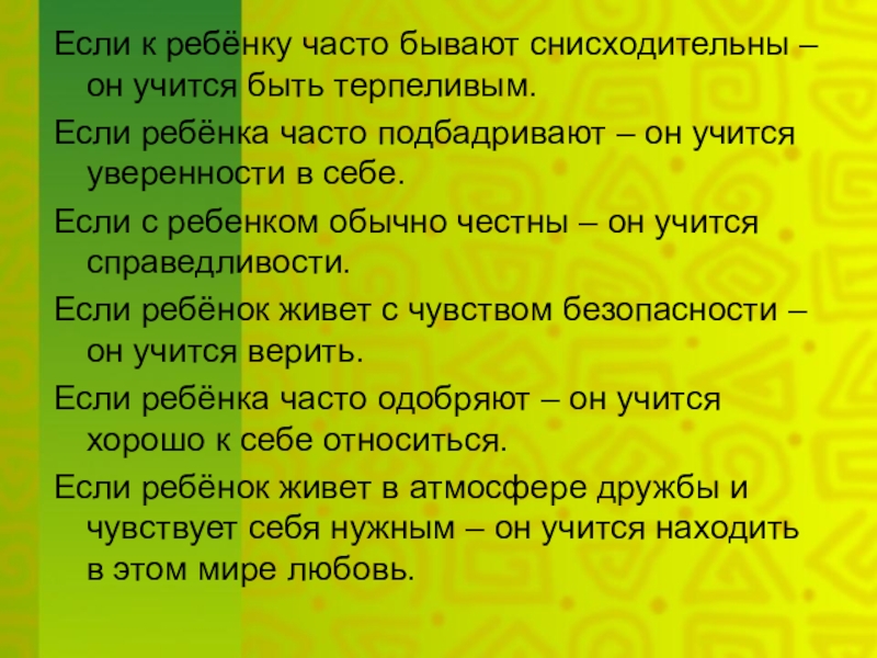 Слайд 16Если к ребёнку часто бывают снисходительны – он учится быть терпеливым.
